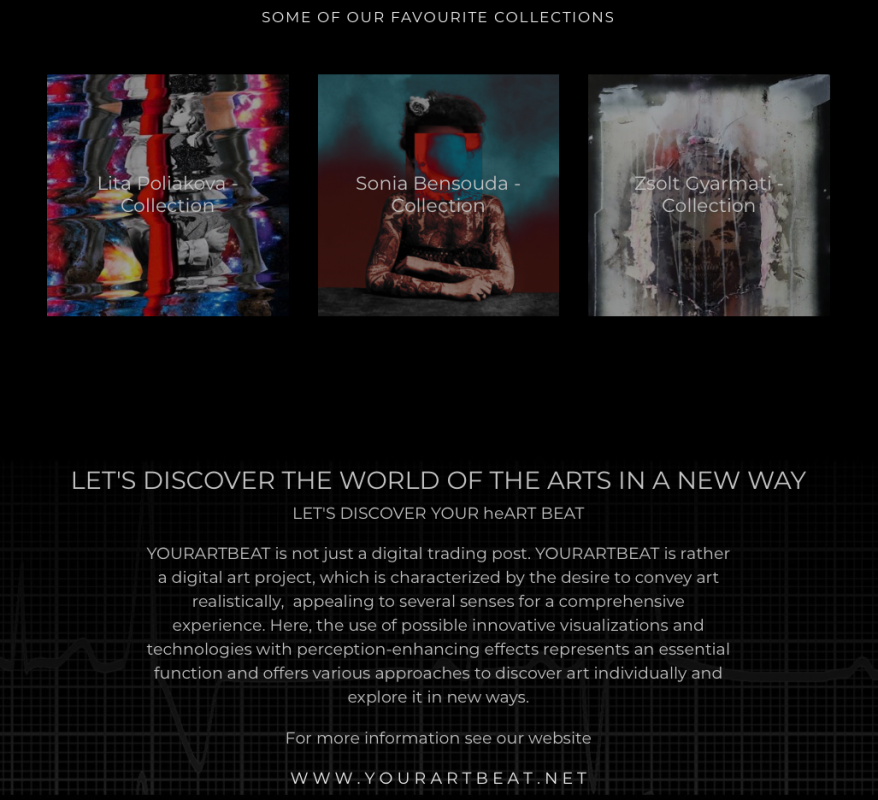 The shop opens the market to more recent yet unconventional visualizations and digital arts. Besides paintings, photographs and objects, we also want to unclose the market more to recent forms of art, such as digital/media art, coded and generative art, or 360° shots and VR experiences. In this respect YOURARTBEAT is flexible and eager to experiment, refusing to accept any limits.