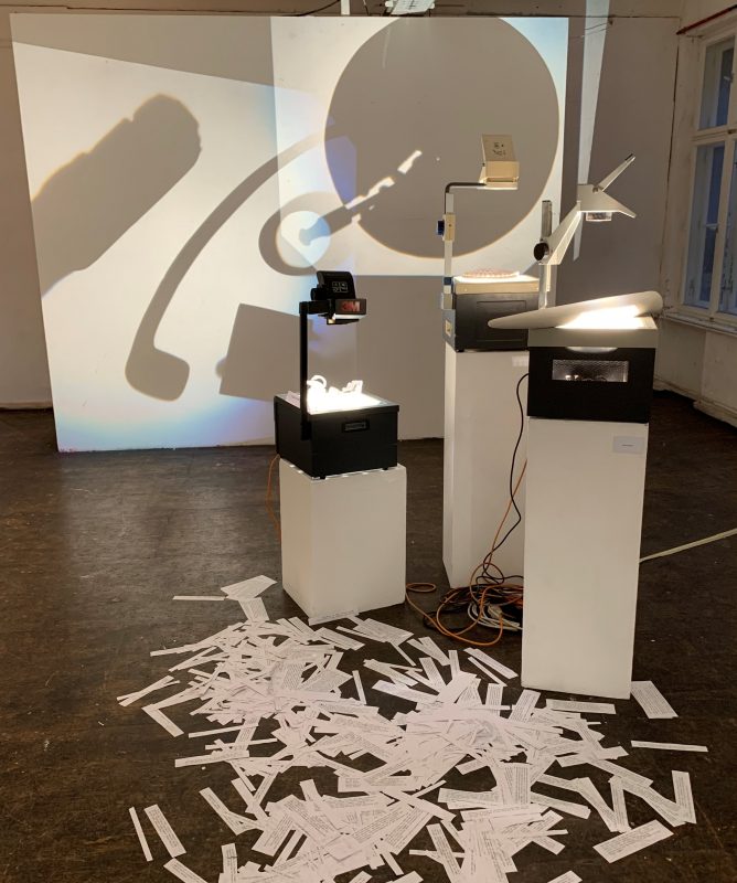 I’m in the house Schwarzenberg visiting the Neurotitan Gallery. First of all, I walk through the first large room to get into another, a little smaller one. In front of me, there are three overhead projectors. On top of them, white objects that at this point I can’t quite make out yet. I walk closer to the installation. Many small pieces of paper are spread on the floor. I stand directly in front of them and realize that different sentences are written on them. Questions, answers, quotations – it reminds me of a dialogue.