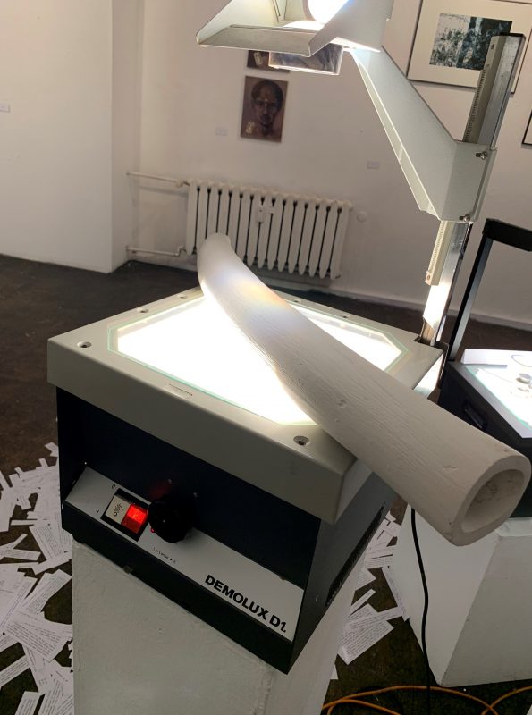 I don’t understand the installation yet, but I think it is exciting and I would like to learn more about it. At one of the overhead projectors, I can see a big elephant tusk.  Not real, of course, just fake. So, what is this installation about?